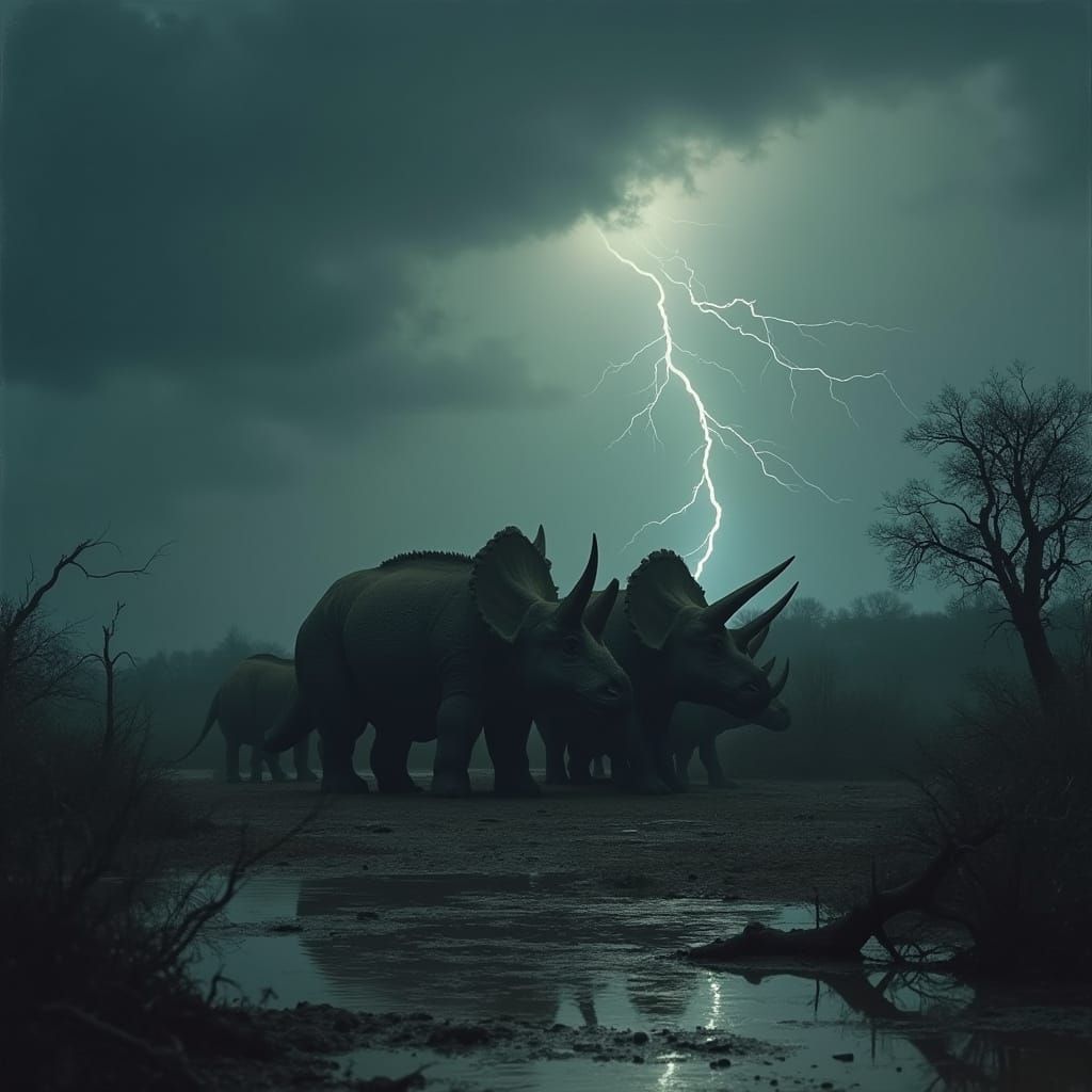 A dramatic scene of Triceratops seeking shelter from a thunderstorm. The image shows a muddy landscape under a dark sky, rendered with film grain and a moody color palette.