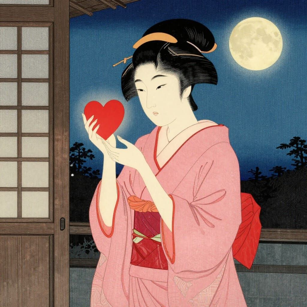 A geisha in a vibrant kimono holds a glowing heart by a traditional house under a moonlit, twinkling sky. Rendered in a serene ukiyo-e style with delicate linework and harmonious colors.