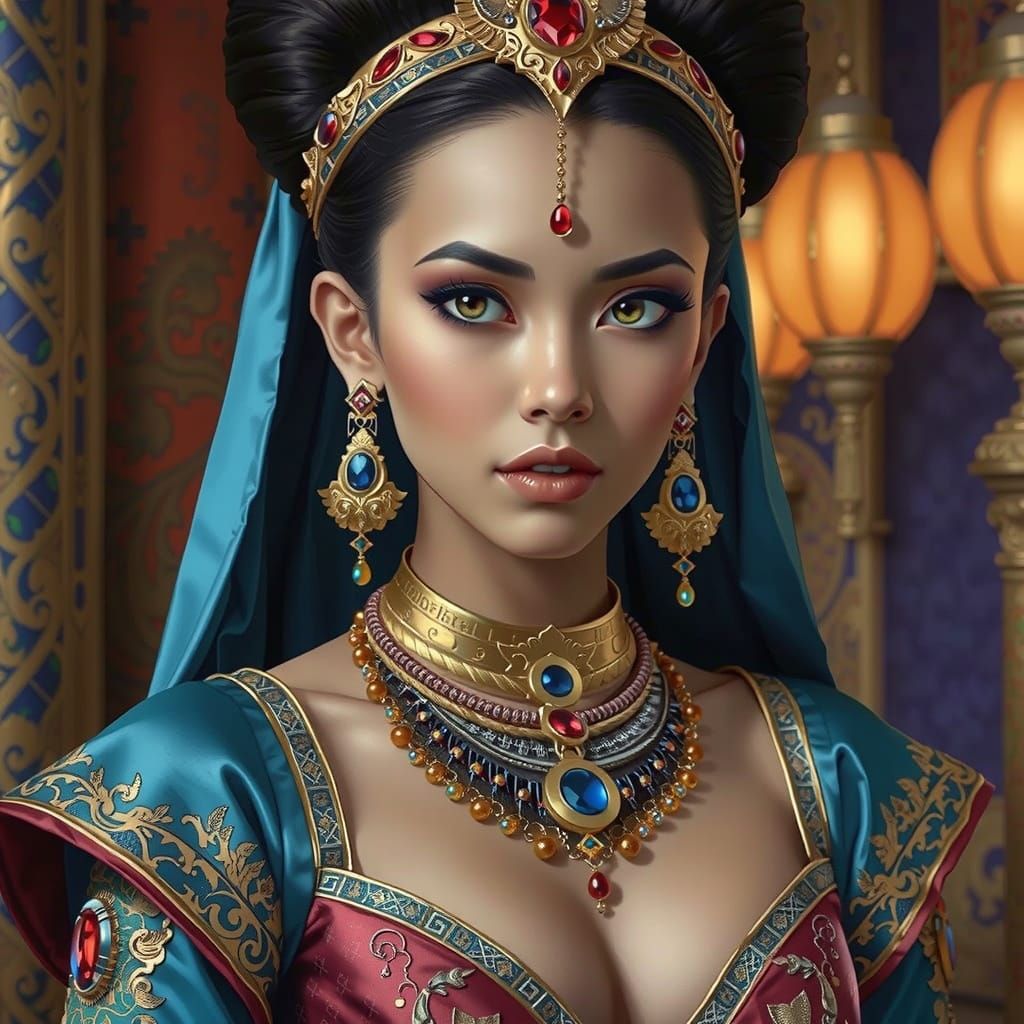 This image shows a stunning portrait of a young woman with a rich cultural heritage, adorned in intricate silk and set against a majestic palace backdrop, blending elements of Eastern and Western architectural styles.