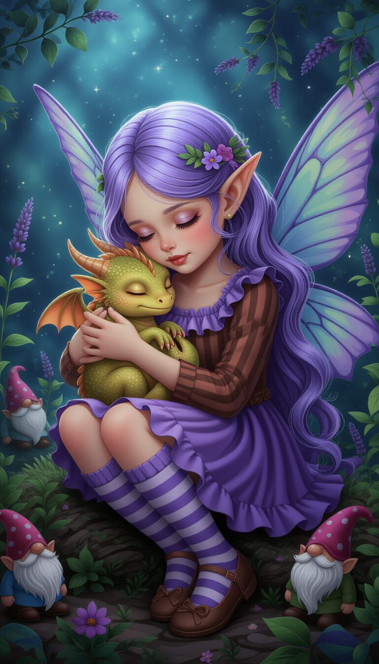 A hyperrealistic image of a tiny fairy girl with lavender hair holding a sleeping baby dragon. Magical plants and gnomes surround them in a vibrant, cozy fairytale setting.