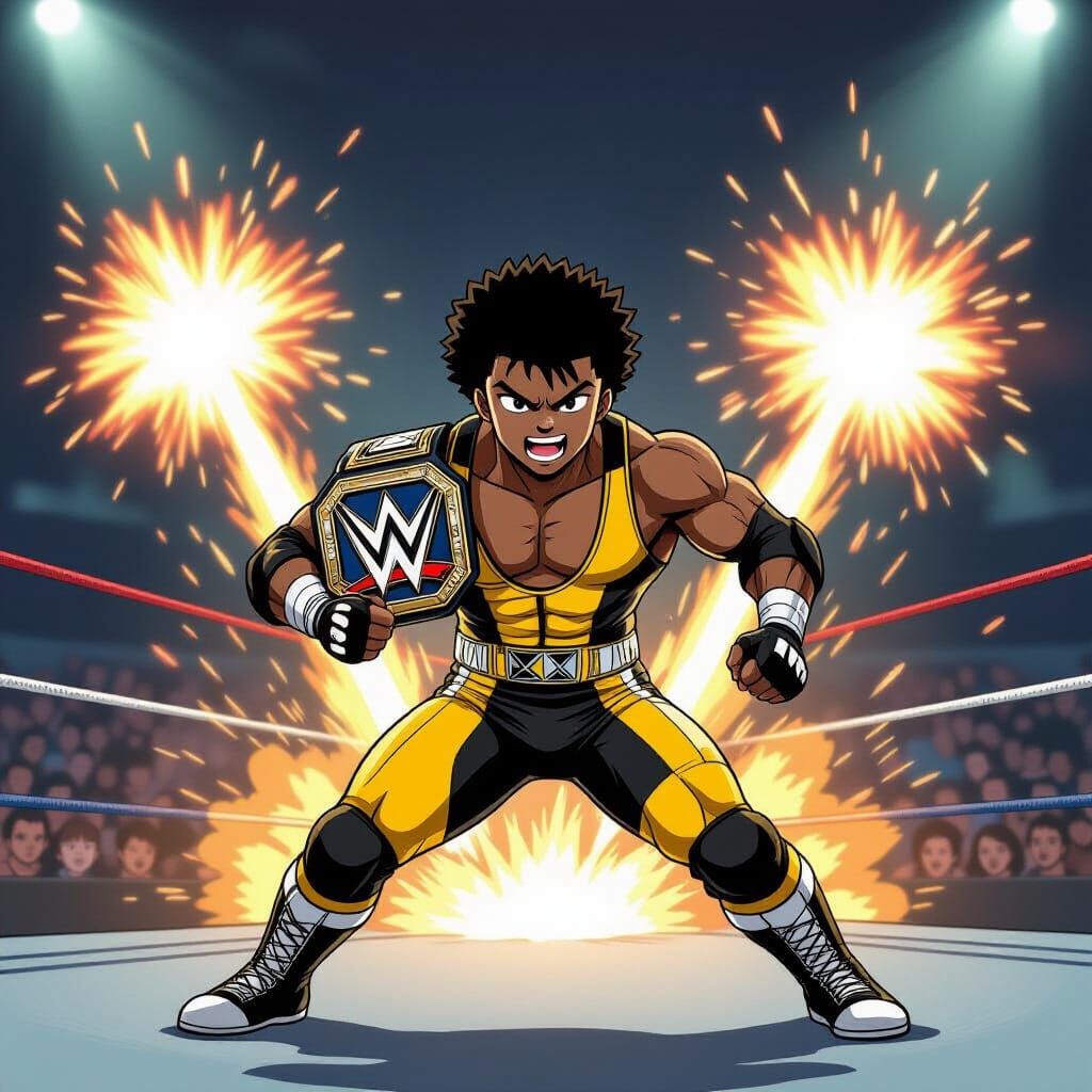 Dynamic anime art of a Black male wrestler in yellow and black gear, holding a championship belt amidst exploding pyro fireworks. Features bold lines and energetic shading.