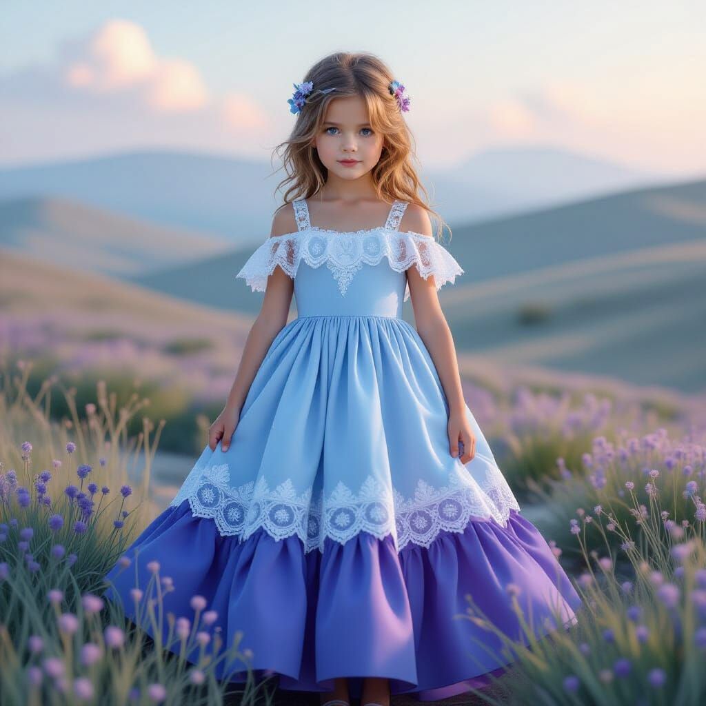 This image shows a young girl in a flowing dress standing in a soft landscape. Her dress is half blue, half purple, adorned with white lace, creating a dreamy, ethereal aesthetic.