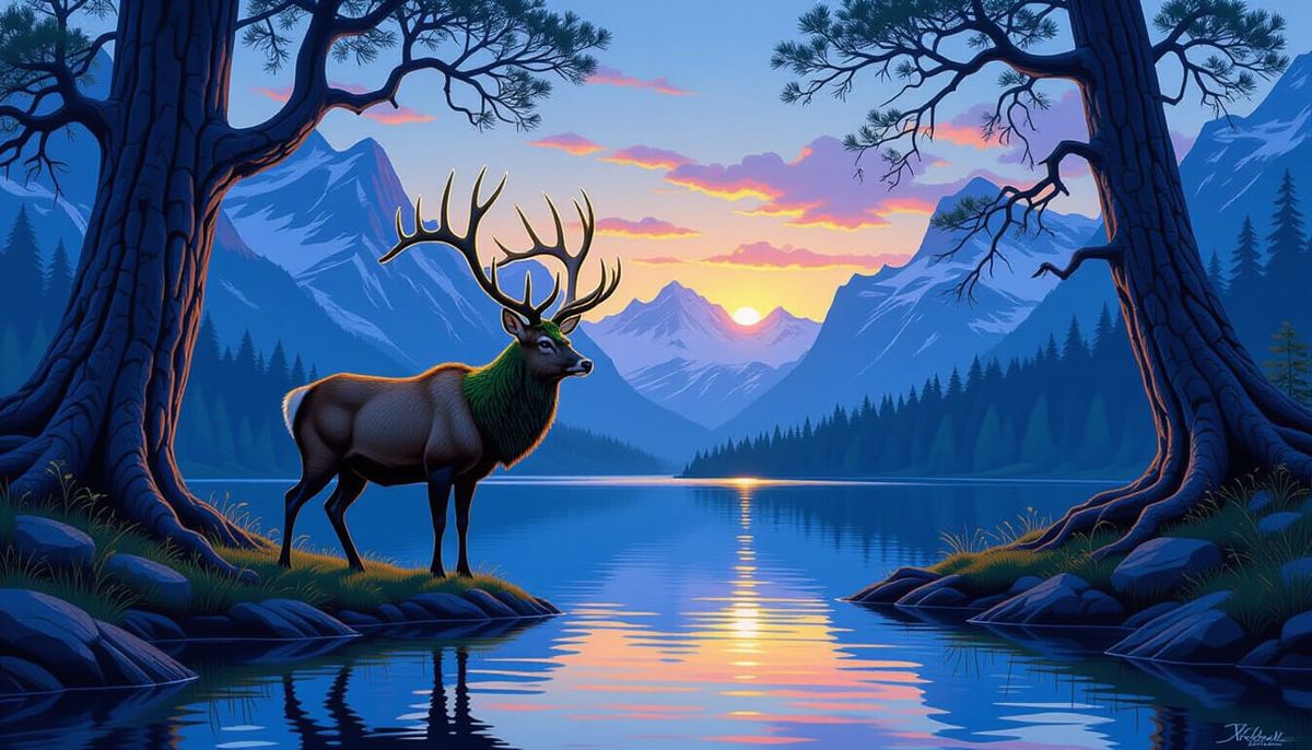 This image shows a majestic stag with glowing moss on its antlers by a tranquil mountain lake reflecting the twilight sky. Rendered in a painterly style with vibrant hues and luminous lighting.