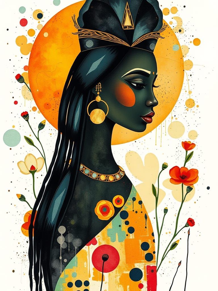 A vibrant image of an African woman surrounded by spring imagery. The artwork uses a decoupage technique with splashed watercolor and imperfect symmetry, in a fantasycore style.