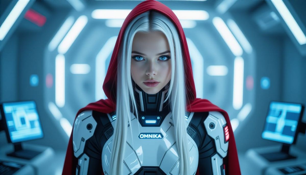 A cinematic image shows three women in futuristic cybernetic suits. They have striking blue eyes and silver hair, surrounded by computer screens in a cyberpunk aesthetic.