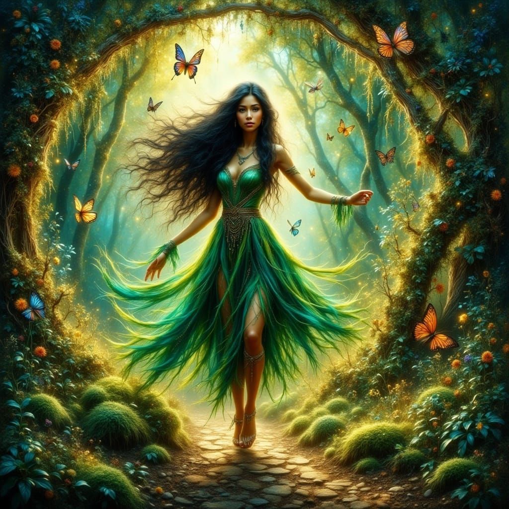 <lora:FiosMysticAura:1.0> <lora:FluxWizardly:1.0> <lora:Beautiful women:1.0> <lora:EtherealVisionsFlux:1.0> create a (full figure front on of a gorgeous elf fairy dancing down a mossy walkway, she has long black hair and is wearing a green gauzy outfit) on a forest pathway, the pathway is illuminated ...