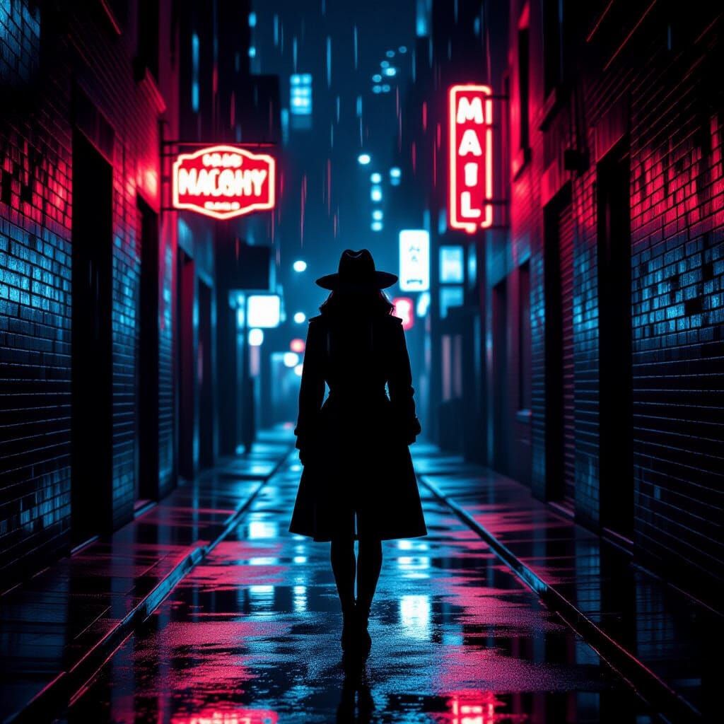 This image depicts a lone female private investigator in a trench coat on a wet, midnight street. Neon lights create dramatic shadows and reflections in a gritty, painterly film noir style.
