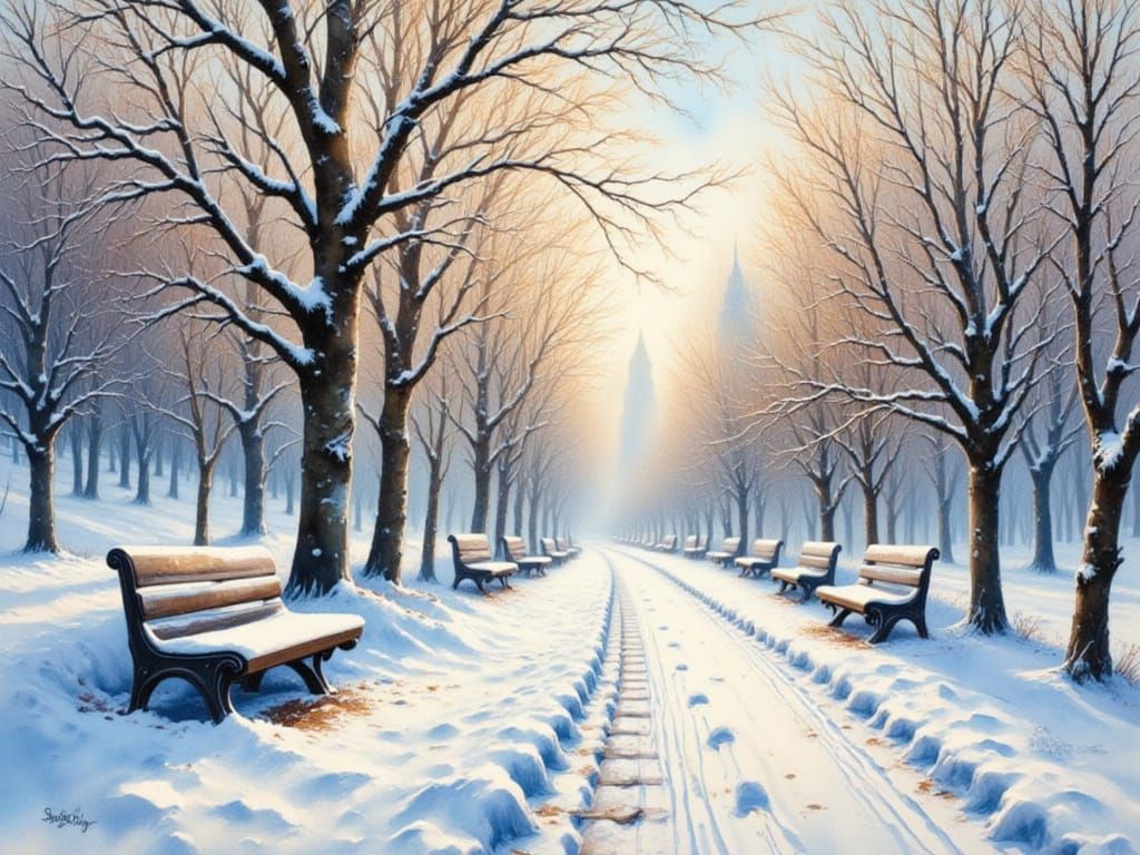 This image captures a tranquil winter park at dusk, featuring snow-dusted benches and trees casting soft shadows. Rendered in a painterly, impressionistic style emphasizing light and shadow.