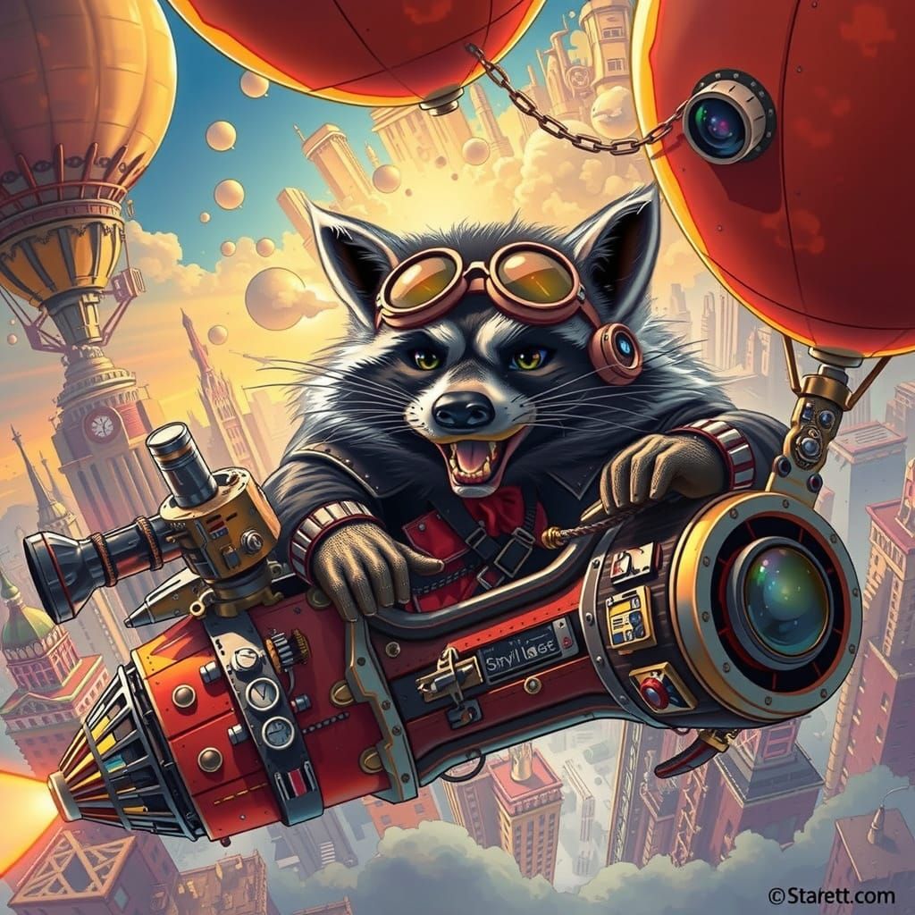 A raccoon supervillain pilots a steampunk zeppelin through a busy sky-city. The image features dynamic lighting, intricate designs, and dramatic shadows in a vibrant, detailed style.