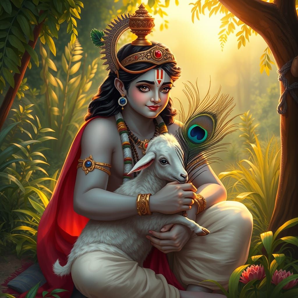This image shows Krishna holding a white goat in Vrindavan. Lush greenery and a glowing peacock feather enhance the warm, soft color tones, rendered with clean, realistic details in a serene and peaceful style.