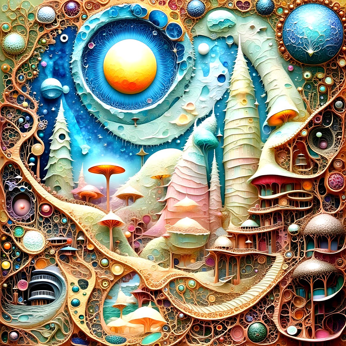 A vibrant display of rainbow fractal structures and tessellations. This surreal image features futuristic domes and intricately detailed architectural forms in an abstract botanical style.