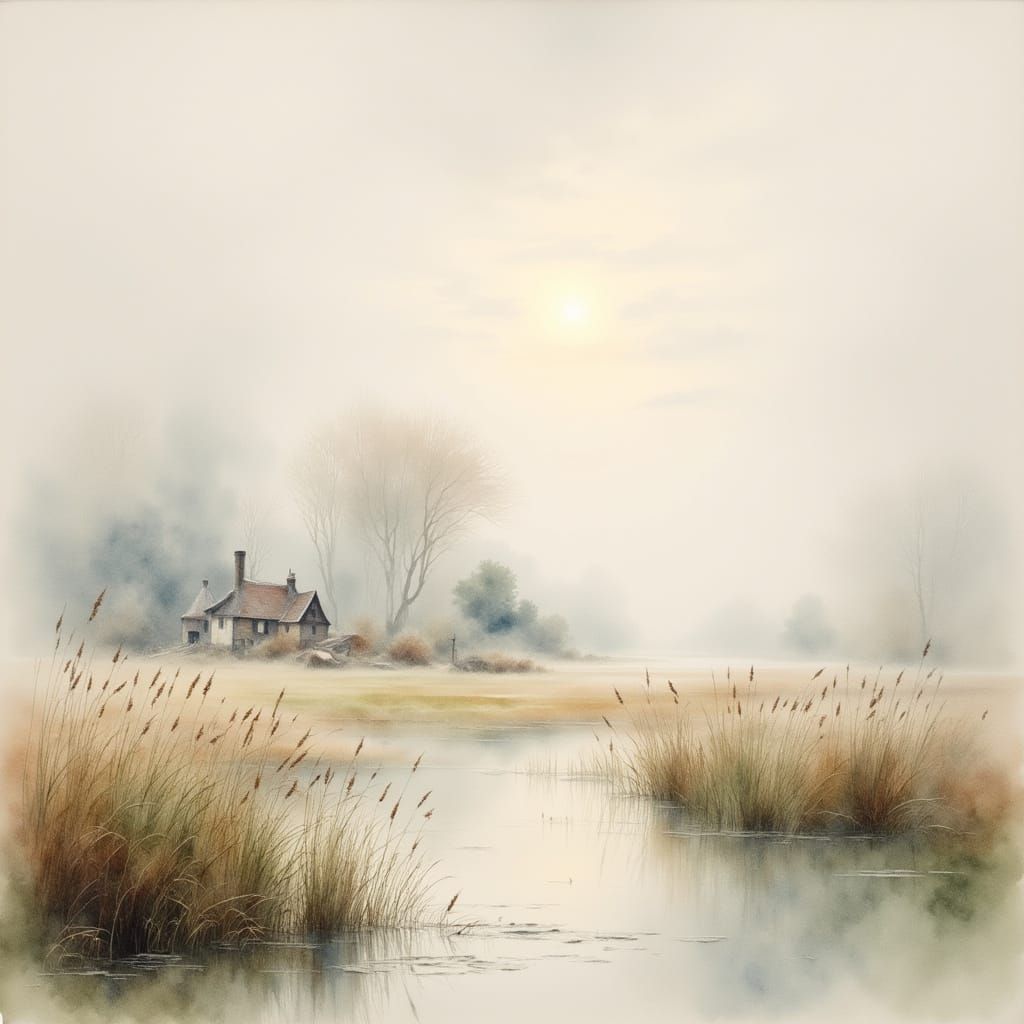 A serene, mist-shrouded marsh landscape rendered in a 19th-century watercolor style with loose brushstrokes. Features a distant village and soft, muted tones creating a tranquil mood.