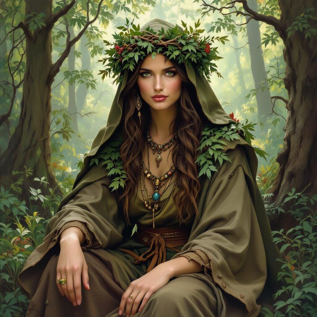 This image shows a forest hag in earthy robes, surrounded by foliage and exuding mystical intensity. The image evokes Pre-Raphaelite romanticism, Russian realism, spiritualism, and folkloric mystique.