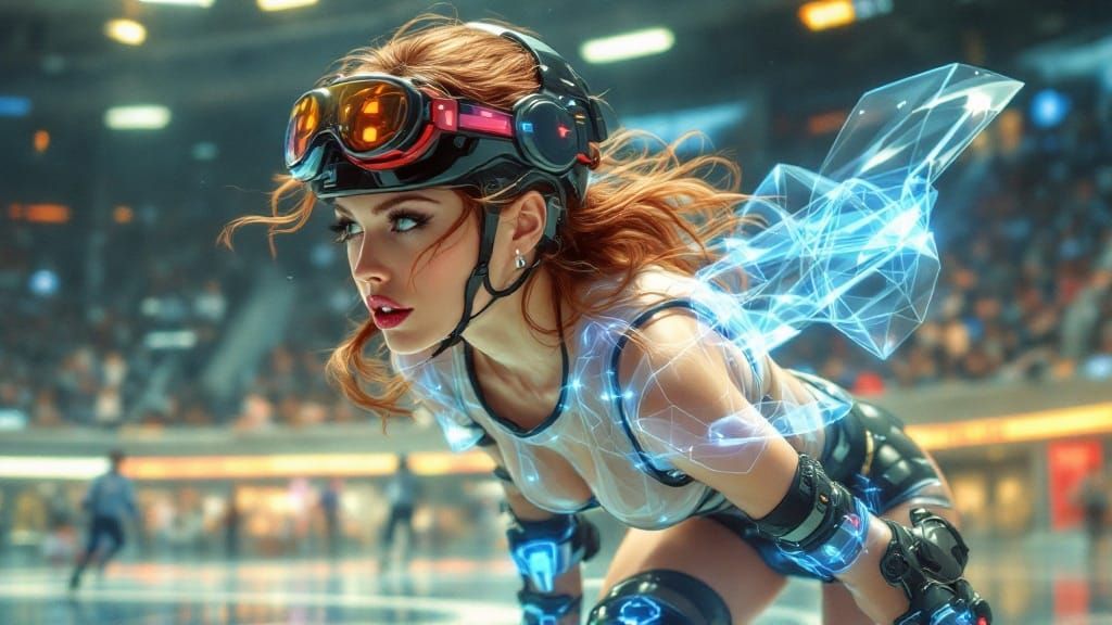A stunning neoclassical-inspired pin-up model appears in a holographic display, showcasing a fusion of classical precision and modern translucency effects.