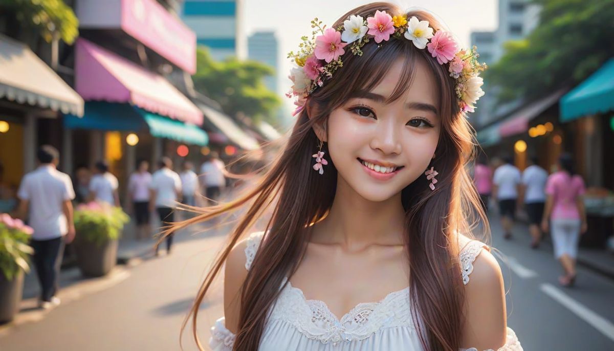 This image captures a young Thai woman standing in the bustling city of Bangkok, adorned with a colorful flower crown and a vibrant pink dress, surrounded by dynamic lighting and soft focus.