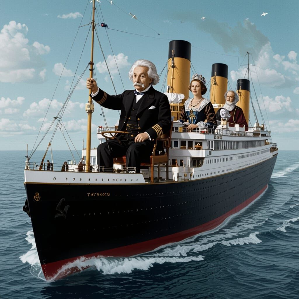 Generate unique images of Albert Einstein captaining the Titanic, flying through clouds with royalty. Free and easy AI image creation.