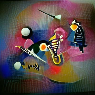 A vibrant abstract resembling jazz music. The image suggests Kandinsky's style, featuring dynamic shapes and colors evoking musical rhythm and harmony.
