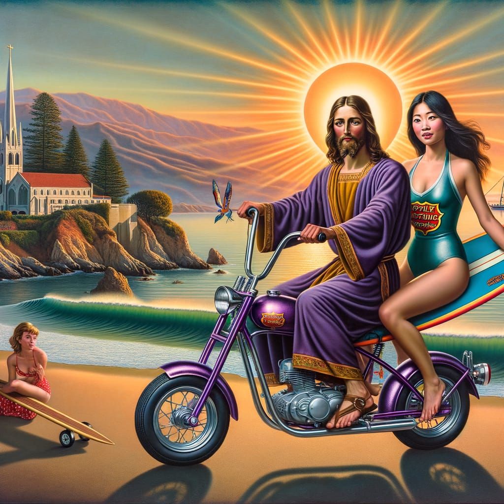 This image shows Jesus Christ riding a purple mini bike with an Asian woman on a surfboard at Santa Cruz beach. The artwork blends Renaissance art with modern realism.