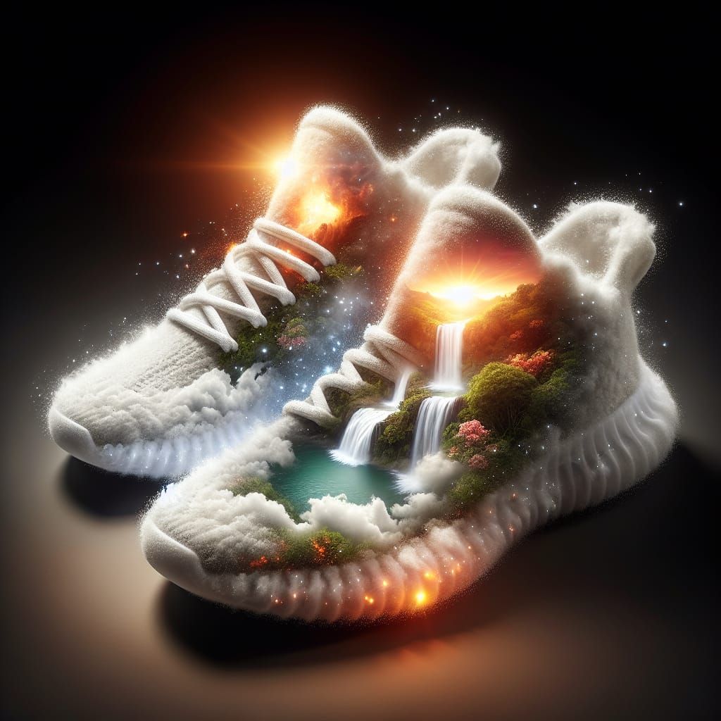 A striking picture of ethereal white sneakers composed of light and dust, revealing a vibrant fantasy landscape within. The landscape features fire-lit waterfalls and lush greenery, all set against a stark black backdrop in hypermaximalist style.
