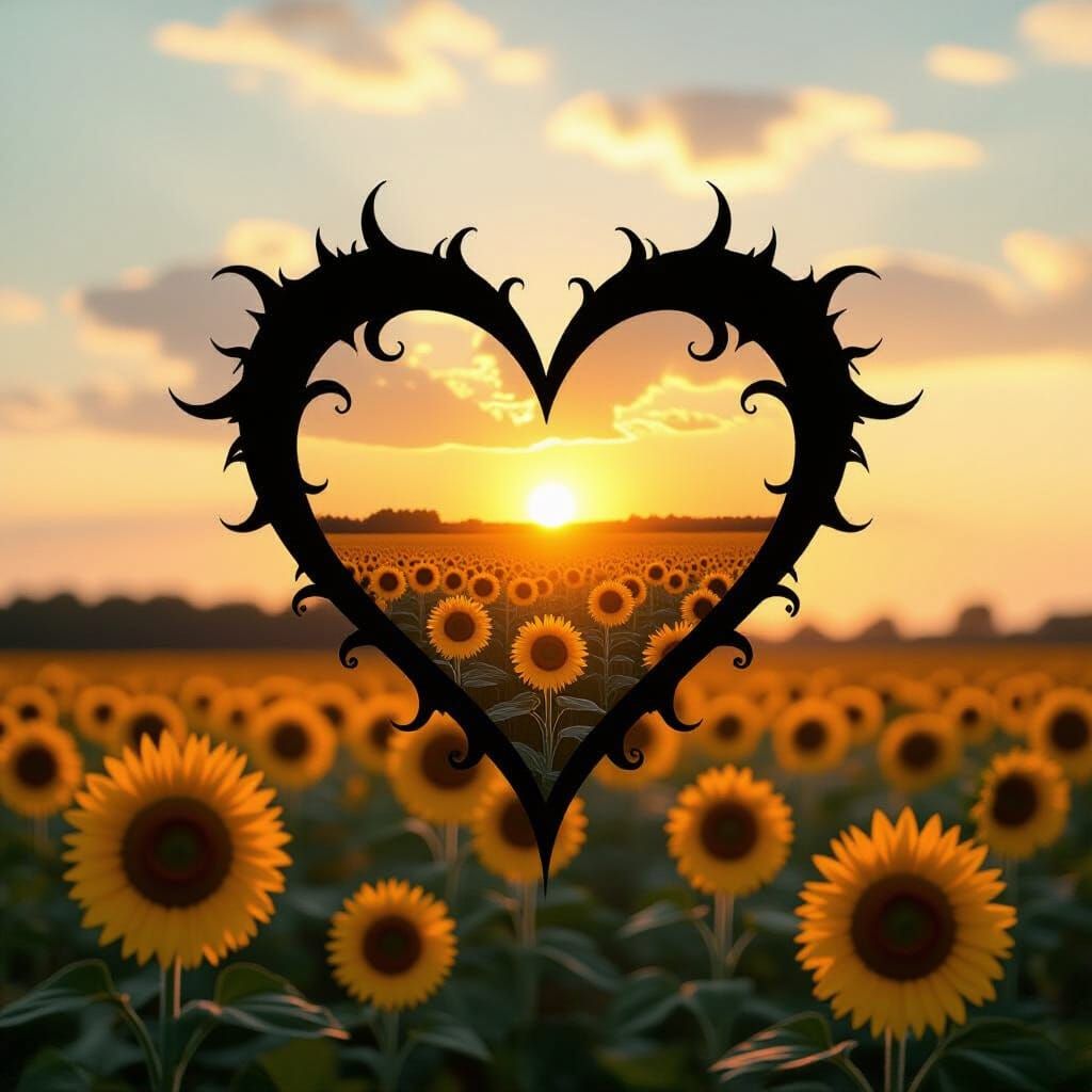 This image features a minimalist gothic heart with a double exposure effect over a sunflower field. The dominant colors are gold and wheat yellow, with a cinematic film grain aesthetic.