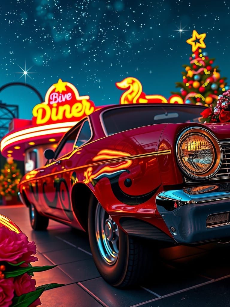 This image features a highly detailed 1960s American muscle car with chrome accents, presented in a fantasy holiday setting with neon lights and unique floral elements. The art style is reminiscent of Gustav Klimt's decorative patterns.