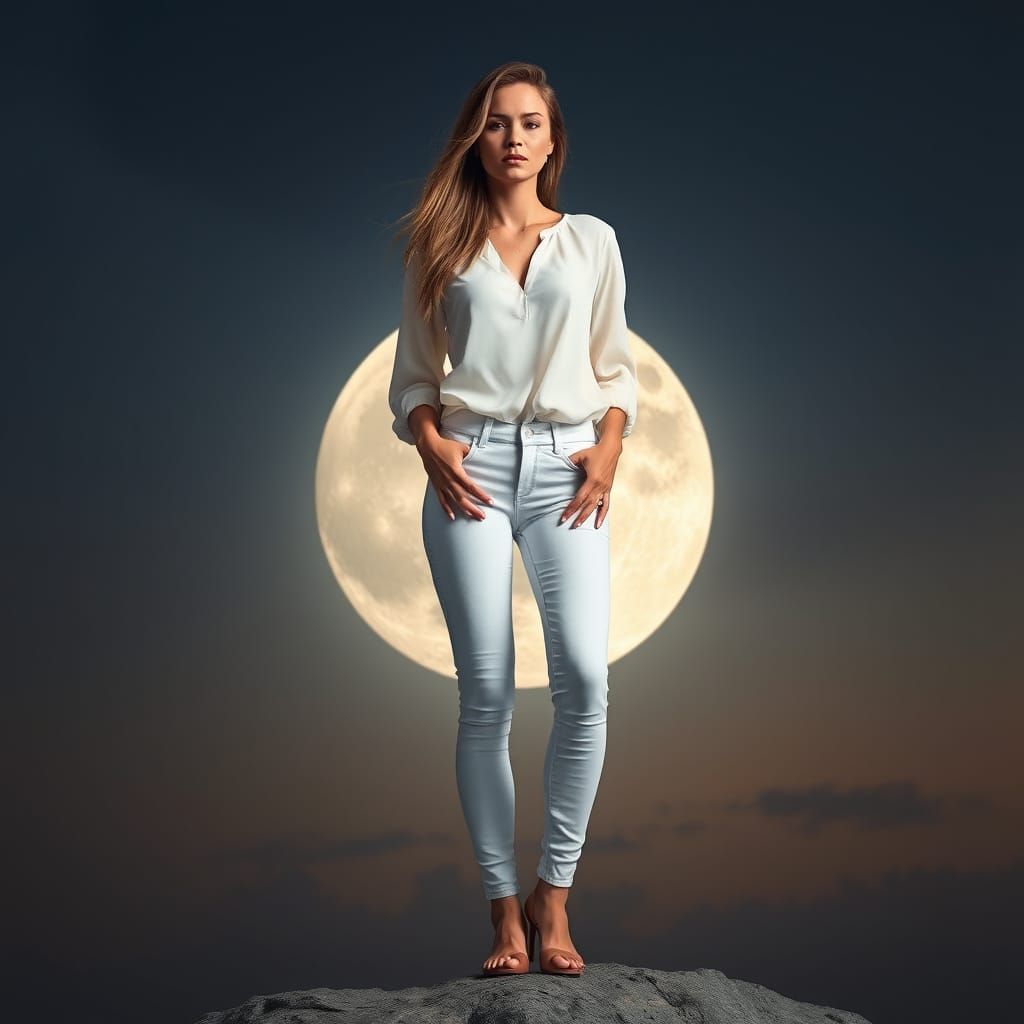 This image shows a stunning woman standing on the moon in a striking white outfit, evoking a sense of otherworldly beauty in a hyper-realistic style.