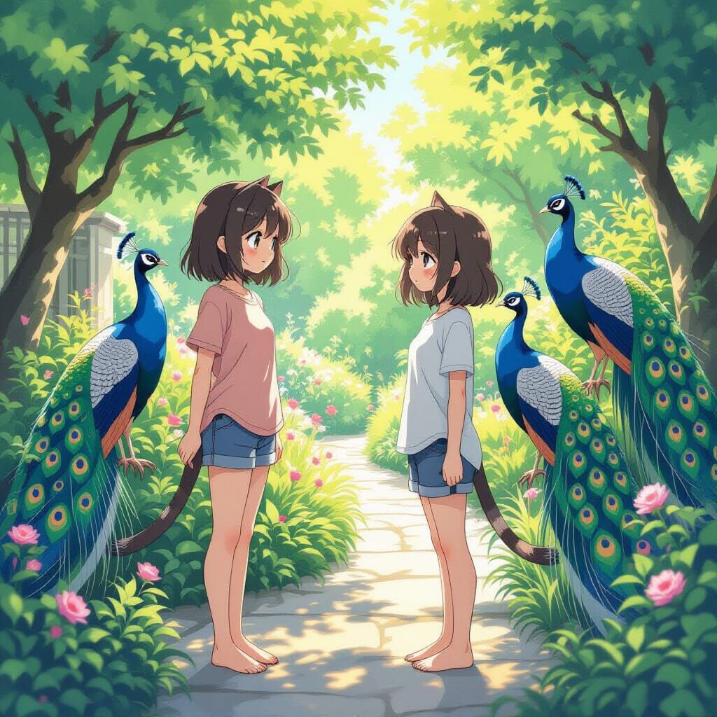 This image shows a barefoot catgirl in a t-shirt and shorts in a lush garden, observing peacocks, rendered with soft, dreamy lighting and delicate textures in a whimsical anime style.
