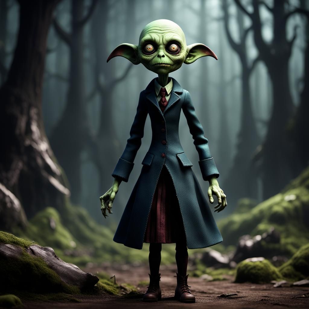 This image shows a slender porcelain doll in the form of a female goblin. The digital painting features deep colors, intricate details, and a fantastical aesthetic in 8k resolution.