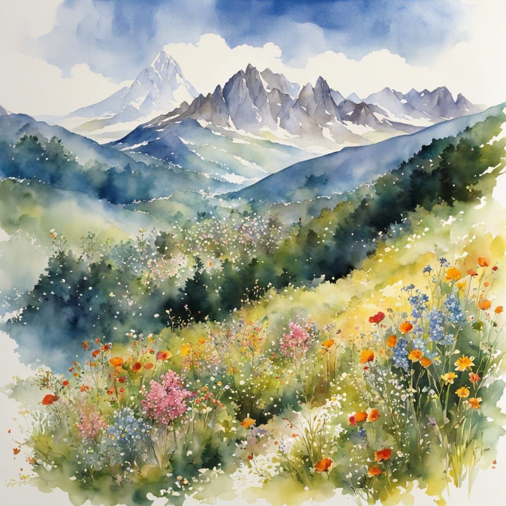 This image shows a watercolor painting of mountains with wildflowers. The artwork evokes anime and children's book illustration styles to create a detailed scene with a solitary monk.