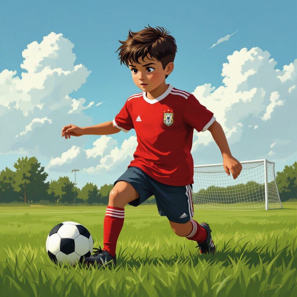 This image depicts a young boy with very short, straight hair and dark brown eyes, playing soccer on a green field. He wears a soccer jersey, rendered in a highly detailed, realistic style.