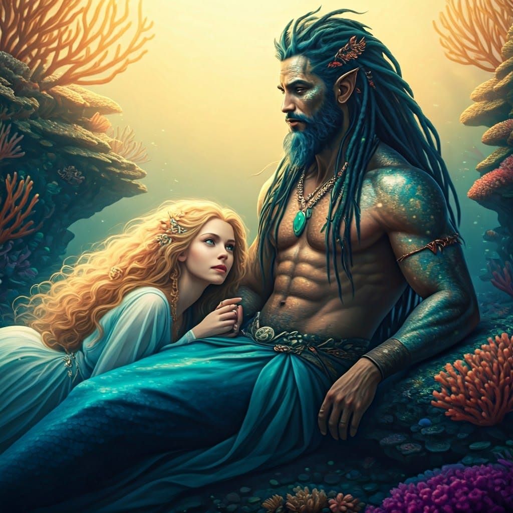 A majestic sea king and his companion bask in the warm, golden light of a serene underwater scene, surrounded by vibrant corals and soft, oceanic hues.