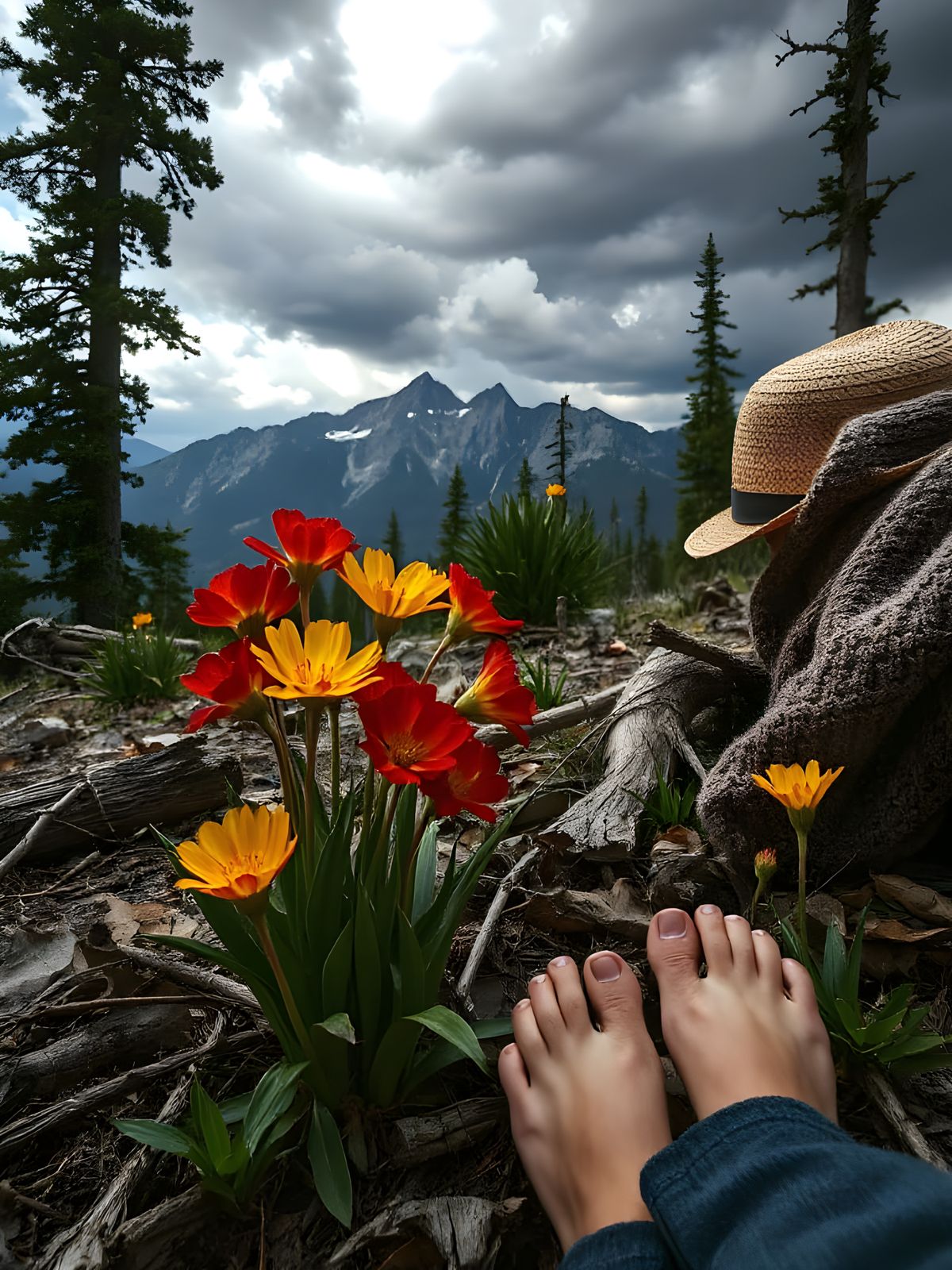 This hyperrealistic image captures vibrant wildflowers pushing through dead vegetation under dramatic mountain lighting. A woman's toes, hat, and sweater are subtly included in the scene of nature's resilience.