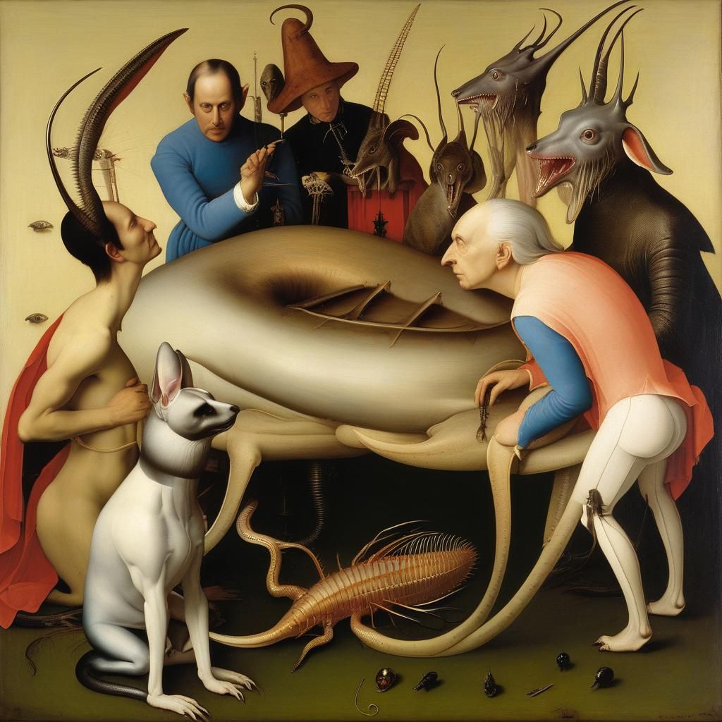A bizarre museum designed by Hieronymus Bosch is depicted as an insane asylum. The image shows surreal, psychedelic, steampunk, and gothic elements in a fantastical, futuristic style.