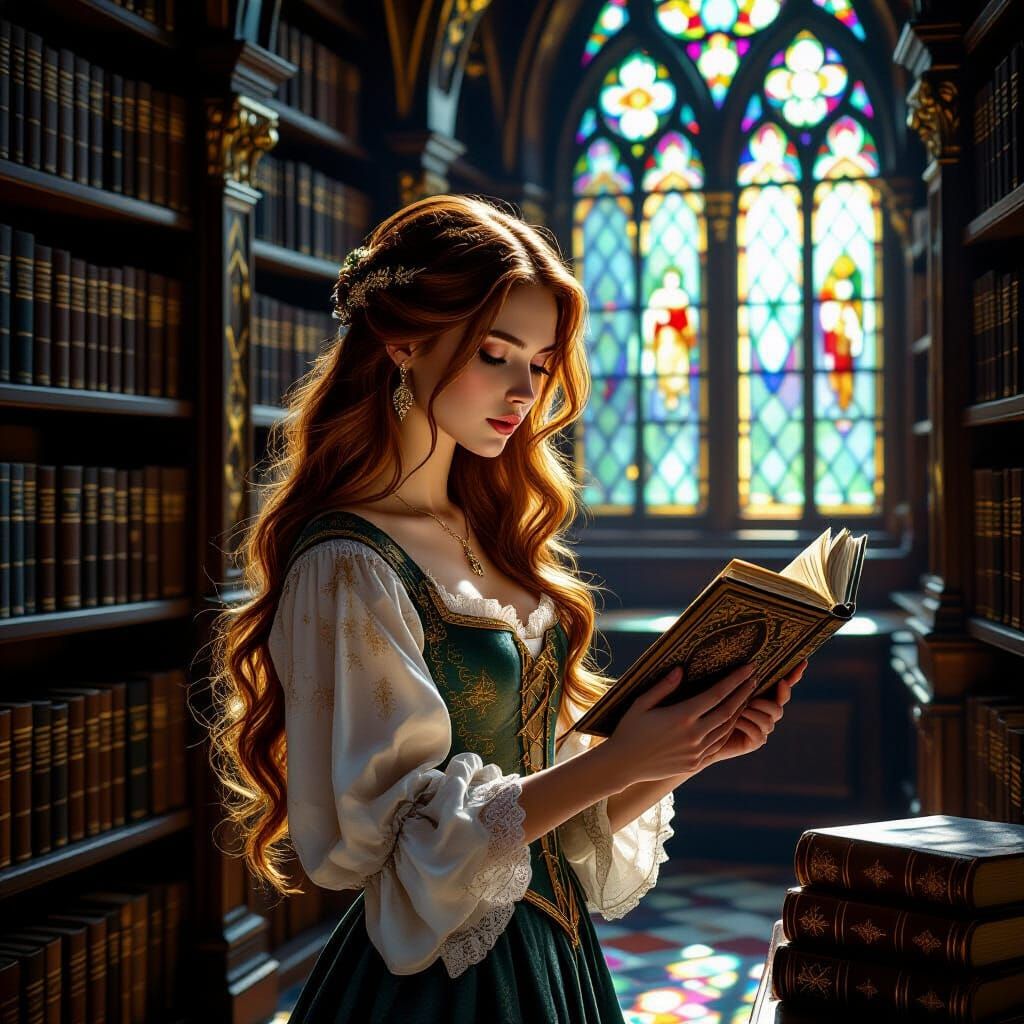 This image shows a woman in a medieval library reaching for a book. Sunlight streams through stained glass in this pre-Raphaelite style image, with rich blues, golds, and greens.