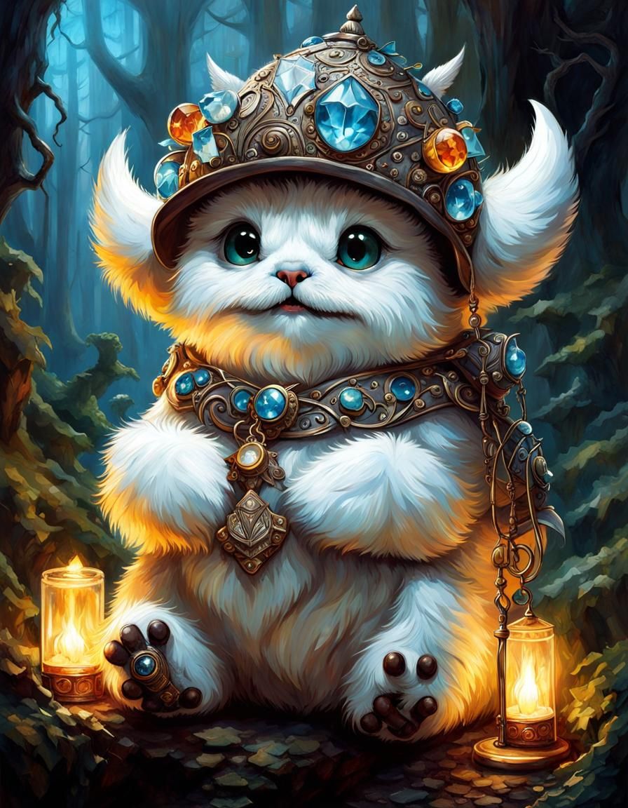 A whimsical image of a crystal marshmallow monster in a fantasy setting. This artwork features intricate details and filigree in a style reminiscent of fantasy illustration.