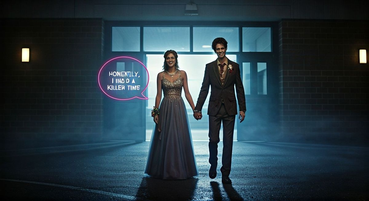 This image captures a darkly humorous teenage zombie horror-comedy film moment. A zombie couple in prom attire exits a gym into a misty lot, sharing a witty exchange.