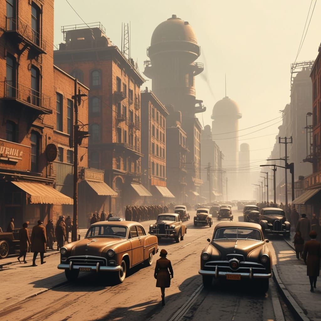 This image shows a city street scene with pedestrians and vintage cars in a smoggy, warm-toned atmosphere. The artwork is reminiscent of dieselpunk and retro-futuristic aesthetics.