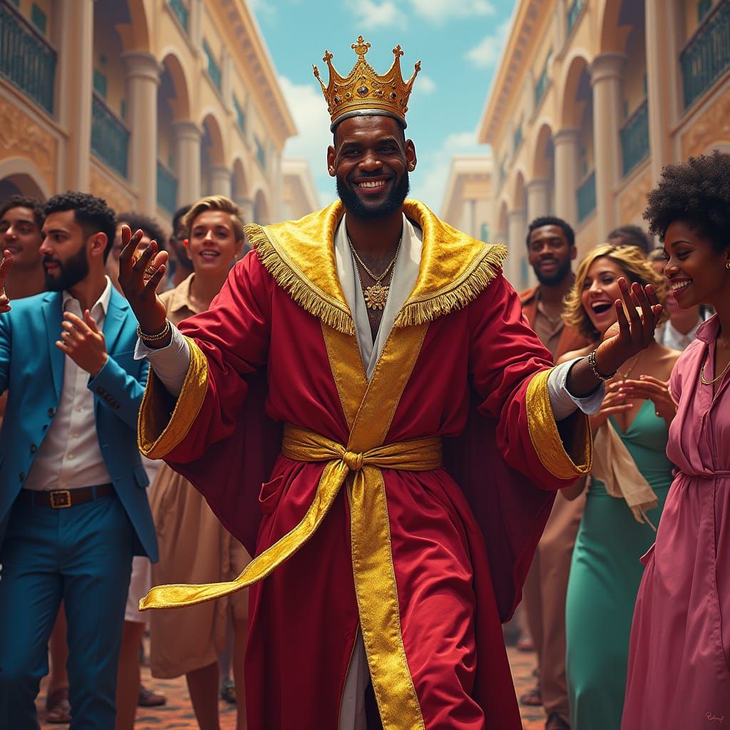 A digital artwork of Lebron James as king, dancing with friends. The vibrant style evokes playful pop art with expressionist elements and majestic portraiture.