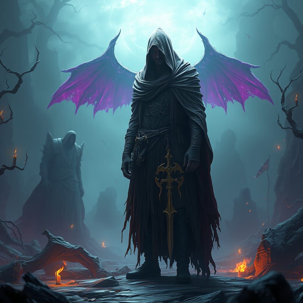 A dark fantasy image shows a sorrowful figure in tattered clothing, symbolizing past failures and hope. The concept art features dynamic lighting, intricate details, hyper-realism, and vibrant complementary colors.