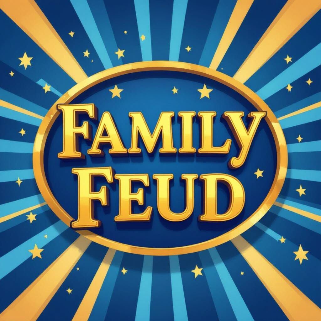 This image features a vibrant Family Feud logo in blue and gold, showcasing playful typography and a clean vector design with a modern, fun aesthetic.