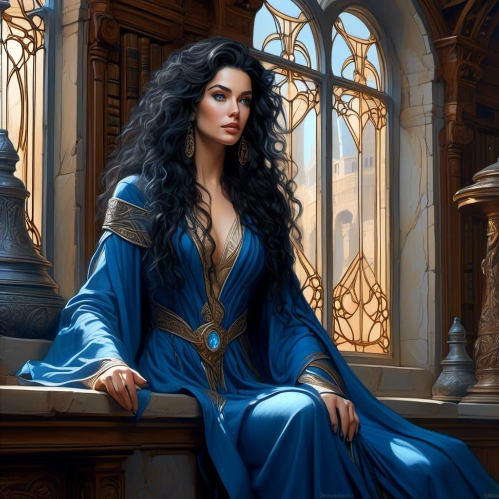 A striking color pencil sketch of a mage. The woman has long curly black hair and blue eyes, and she is wearing elegant robes in a mage tower library. The image has dynamic lighting.