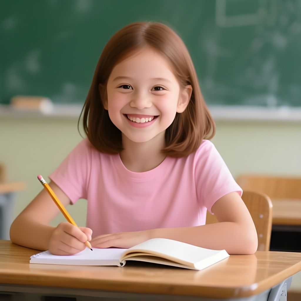 This realistic photo shows a happy young girl seated at a wooden desk, pencil in hand. Soft natural light highlights her engaging expression in a warm, inviting classroom setting.