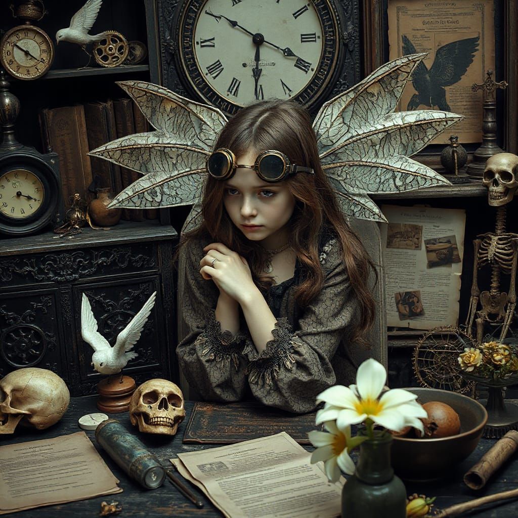 This image depicts a melancholic, gothic-inspired scene of a young woman adorned with intricate steampunk wings, surrounded by vintage clockwork machinery and antique trinkets, with a somber expression and a nostalgic atmosphere.