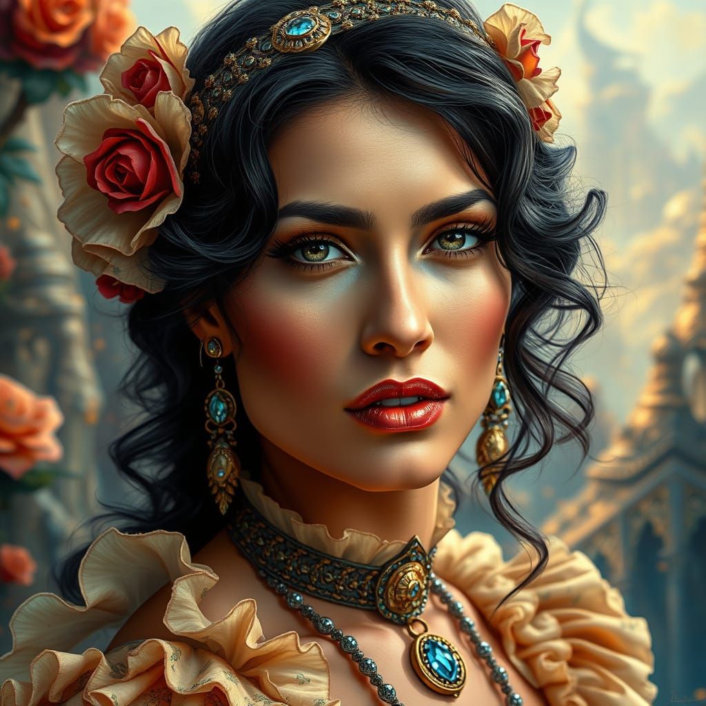 A captivating close-up portrait of a gypsy woman with ornate ruffled clothing and elegant wavy hair. The artwork showcases triadic colors and dynamic lighting in a hyperdetailed digital oil painting.