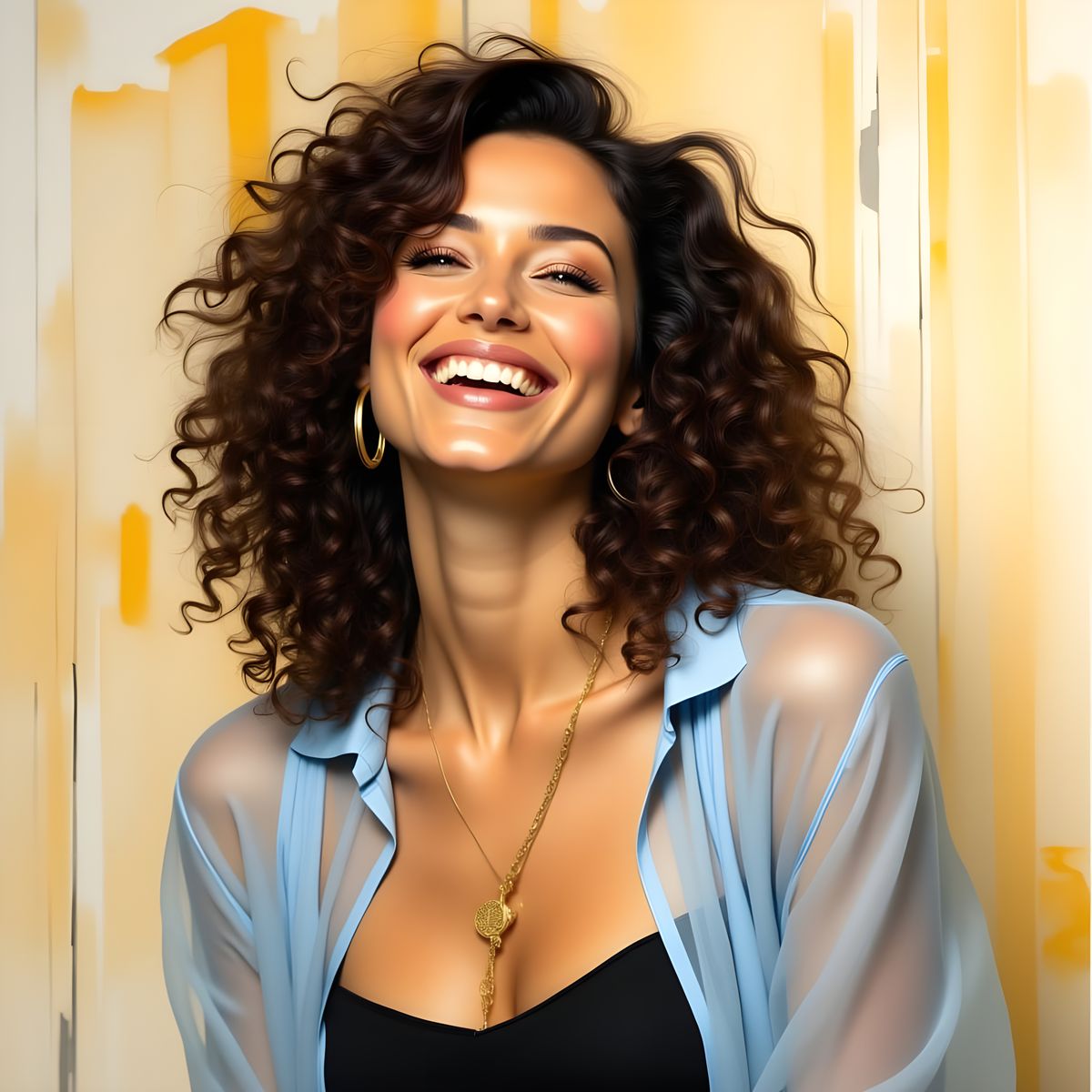 A close-up portrait of a woman laughing, set against a soft, light-yellow and pale-beige background with whimsical elements. Her curly hair and delicate necklace add to the natural, contemporary styling.