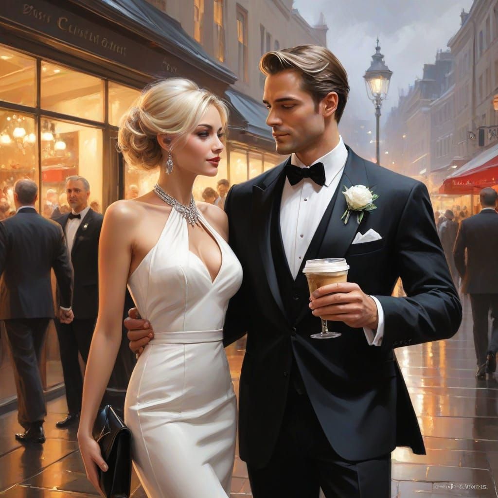 A surreal image of a coffee cup used as a purse at a formal event. The artwork evokes a watercolor style with soft, dreamy qualities.