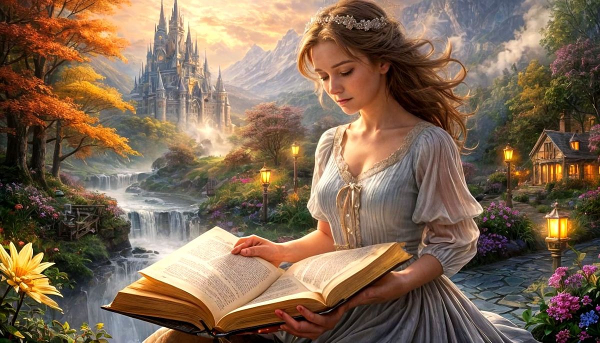 This hyper-detailed 8K HD image depicts a woman opening a book, with mist-filled ethereal fantasy stories emerging. Rendered in a style reminiscent of Thomas Kinkade's luminous art.