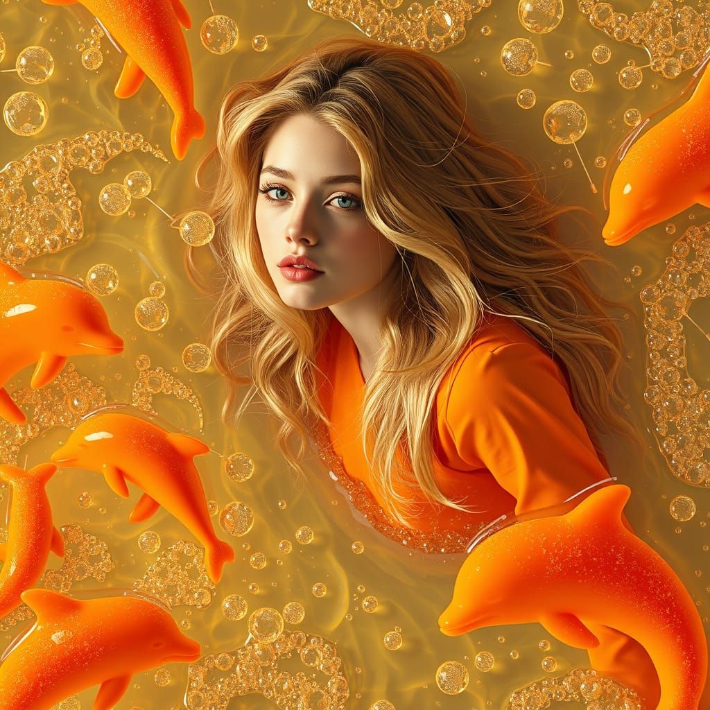A surreal image of a woman with golden hair floating in a bubbly soda ocean. Gummy candy dolphins swim in the amber liquid in this work rendered in a vibrant pop surrealist style.