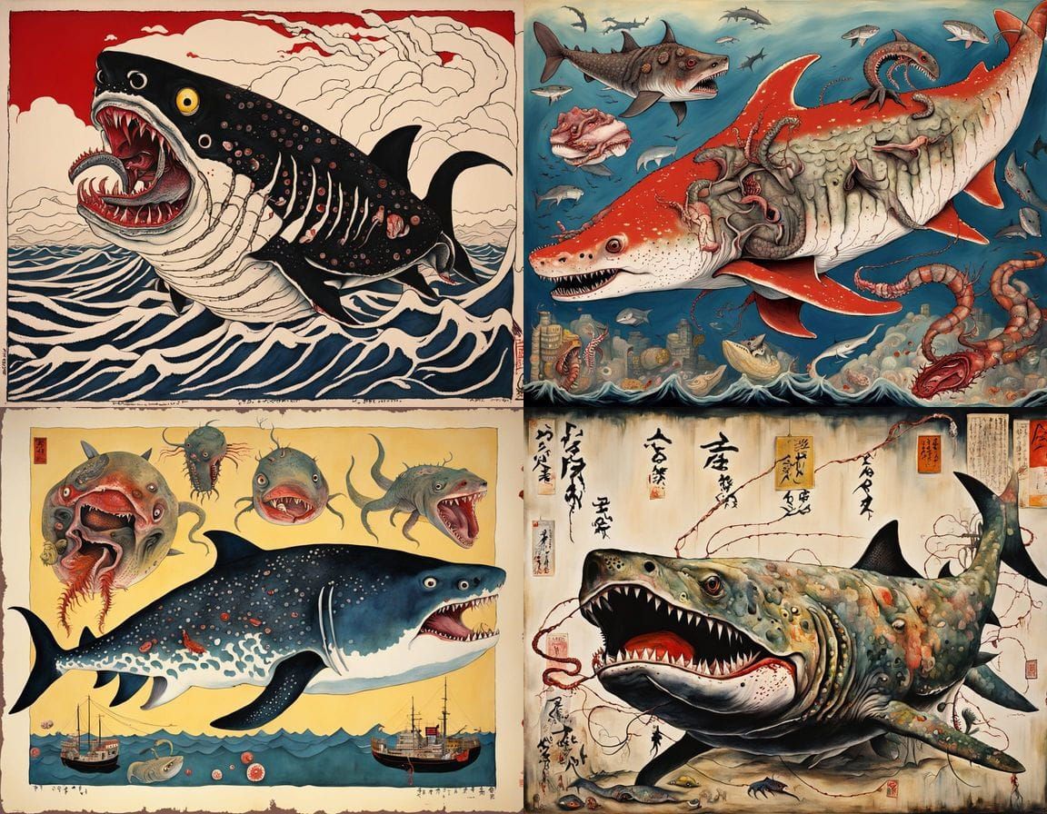 A surreal and disturbing creature with deformed features and unnatural appendages, born from a twisted blend of marine and terrestrial elements, reminiscent of Japanese art and the works of Salvador Dali and Egon Schiele.