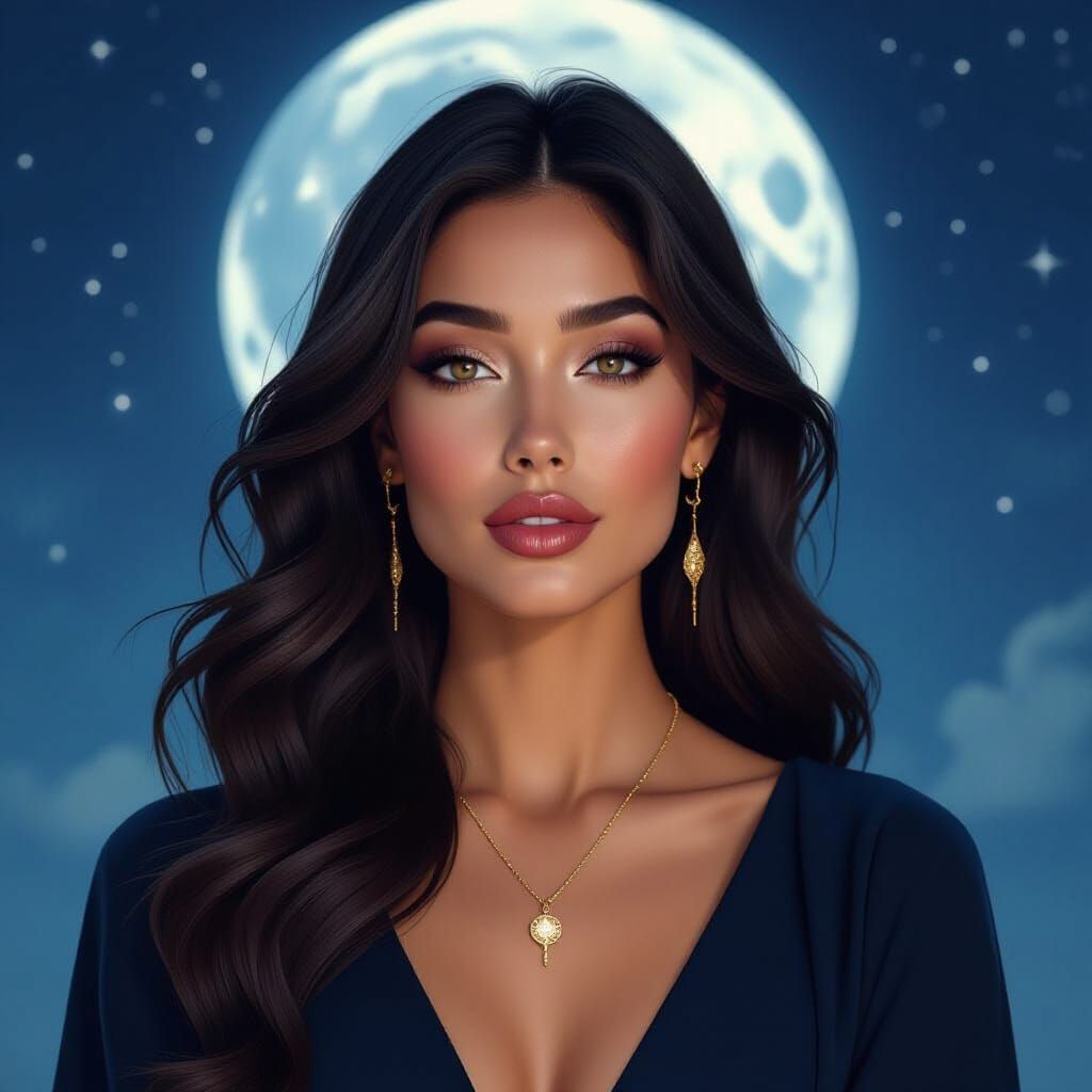 This image portrays a tall, slender woman with luminous pale skin and dark, glossy hair. Her intense sapphire eyes hold ancient wisdom. Dressed in flowing dark blue garments with subtle celestial details.